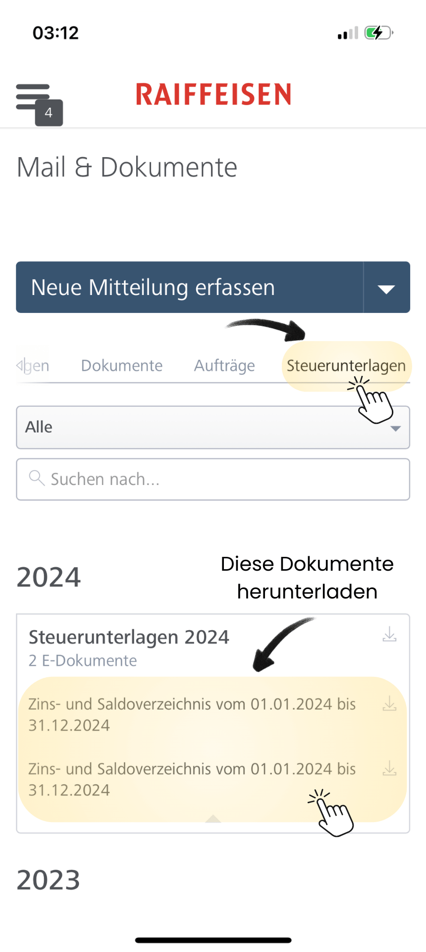 Hier ist eine Anleitung, wie du den E-Steuerauszug deiner Raiffeisen Kontos auf dem Handy herunterladen kannst.